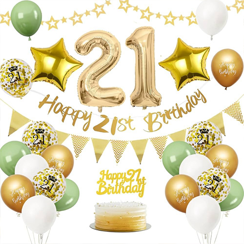 21. ballonsæt: Dette 21. ballonsæt er sammensat af latexballoner, folieballoner, fødselsdagsflag og andet tilbehør. Den er nem at samle og kan gøre din 21 års fødselsdagsfest mere ceremoniel. Sådan en høj kvalitet og betagende indstilling vil hjælpe dig med at lyse op på din 21-års fødselsdag og gøre dette til et dyrebart øjeblik, som din datter, dig selv og hele familien aldrig vil glemme.