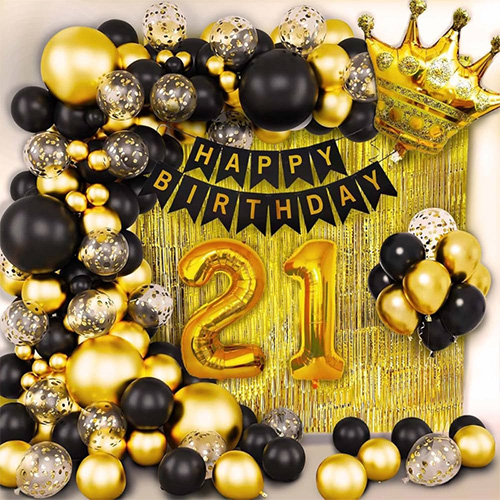 21. ballonguirlandebuesæt: Dette 21. ballonguirlandebuesæts hovedfarver er sort, guld, sølv osv., som er meget velegnet til mænd og kvinders dekoration ved den 21. fødselsdagsfest. De kan hænges på døren eller væggen, og er også meget velegnede til indendørs og udendørs brug for at skabe en unik 21 års fødselsdagsfest for mænd eller kvinder.