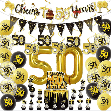 Papirvedhæng: lavet af sort guld, guld og sølv kontrasterende spiralpapir, dekoreret med temamønsteret "50", 35-45 cm i længden, med praktiske kroge på toppen, som kan hænges fra loftet, lysekroner eller bjælker og søjler. Den dynamiske effekt af naturligt fald kan berige det rumlige niveau og skabe en fleksibel atmosfære.
