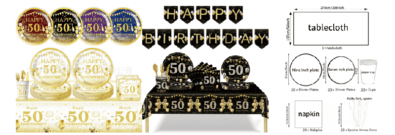 Papir fødselsdagstopper: som kerneelementet i kagedekoration tager hovedkortet ordene "tillykke med fødselsdagen til 50 år" som kernen og matcher hovedkagedekorationen med fyrværkeri, stjerner, fødselsdagshat og andre former. Understøttende runde "50", lovende skyer, krone og andre minikort, lavet af fortykket pap og matchet med solide bambuspinde, kan dekoreres med cupcakes og dessertborde, med udsøgte detaljer.