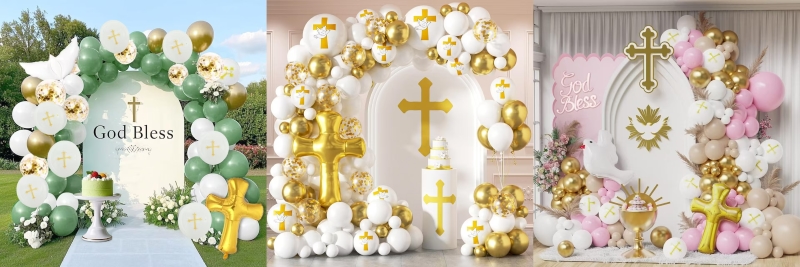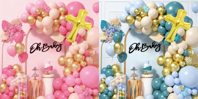 Baby shower ballonbuesæt har to stilarter, en stil er til babypiger og en stil er til babydrenge. Babypigesættet er lavet af macaron pink farve ballon, mat lys rose farve ballon, mat lys hud farve ballon, metallisk guld farve ballon og et guld gud velsigne kryds. Baby boy sættet er lavet af macaron blå farve ballon, retro hav blå farve ballon, mat lys hudfarve ballon, metallisk guld farve ballon og et guld gud velsigne kors. Begge har limprikken og ballonturen, du kan bruge dem til at lave en hel smuk guirlande.