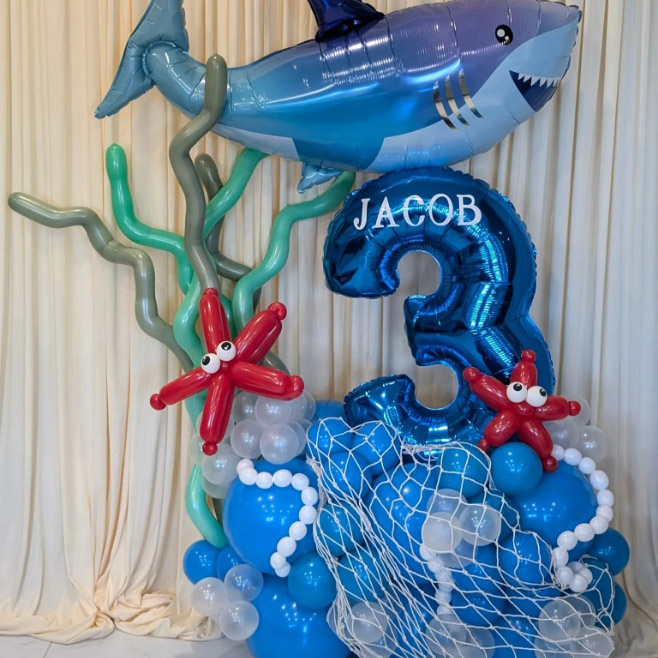 2. folieballon:Ballon Garland Med hajfolie Balloner er denne pakke udstyret med folieballoner med forskellige tegneserie marine væsener, såsom hajer, søstjerner, vandmænd og søheste. Derudover kan vi også designe brugerdefinerede folieballoner til dig i henhold til dit mønster for at skabe en unik ballongarland med hajfolieballoner.