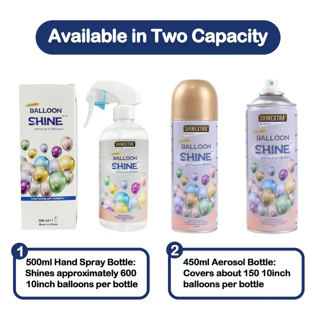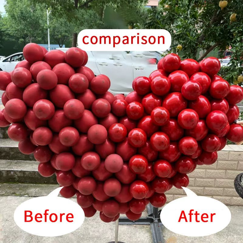 Balloon Shine Spray bruger en innovativ oliebaseret formel. Dens mikromolekylære struktur trænger hurtigt ind og klæber til latexoverfladen og danner en sømløs, højglansbeskyttende film. Behandlede balloner kan opnå et glansforøgelse på over 300%, hvilket resulterer i livlige, rige farver.