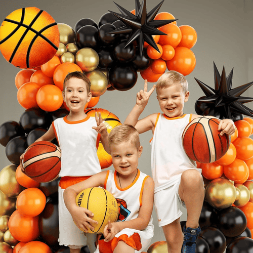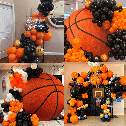 Basketball ballon guirlande kit er et symbol på sportsånd. Den leveres med flere latexballoner og flere folieballoner. Som det er for basketballtemaet, er farverne i dette sæt hovedsageligt orange og sorte, og for at lave forskellige lagmetalliske guld latex ballonerer også tilføjet. Den samlede stil af det er meget attraktivt, det kan øjeblikkeligt forbedre atmosfæren til din fest.