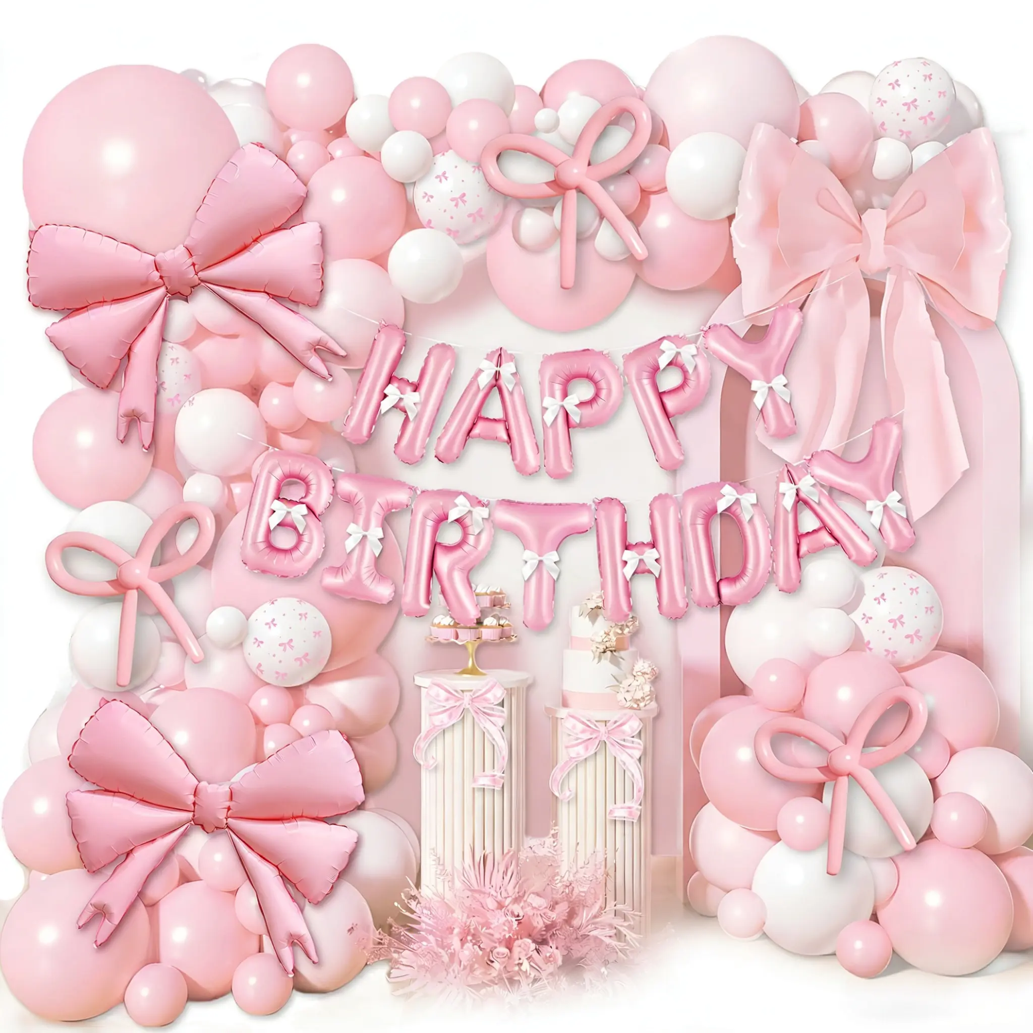 Dette sæt inkluderer mat babylyserød ballon i 5 tommer, 10 tommer, 12 tommer og 18 tommer, mat hvid farve i 5 tommer, 10 tommer, folierosa sløjfeballon, mat babylyserød 260 lang ballon, båndsløjfe, limprik og ballondekorationsstrimmel.