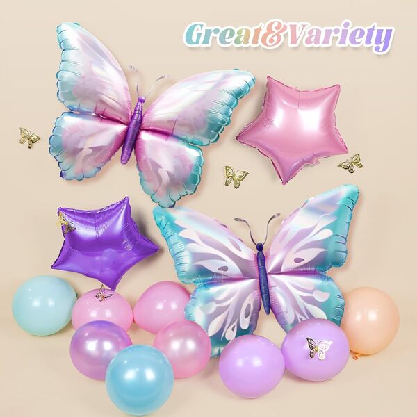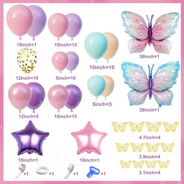 Butterfly ballon guirlande kit indeholder hovedsageligt latex balloner, de kommer i forskellige størrelser (5 tommer, 10 tommer, 12 tommer og 18 tommer). Deres farver er sædvanligvis domineret af pink, blå, lilla osv. For at øge sættets lagdelingseffekt kan du også se gennemsigtige latexballoner og konfettilatexballoner. Som temaet for sættet er sommerfuglefolieballonerne også uundværlige. De fleste af deres farver er lyse (blå/pink/lilla...), og den gennemsnitlige størrelse er 18-30 tommer (med tilpassede størrelser tilgængelige). Derudover har de et meget realistisk udseende, der nærmest er naturtro.