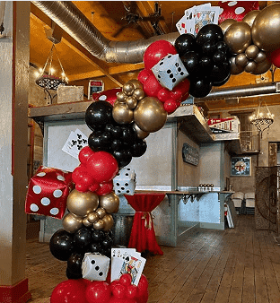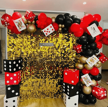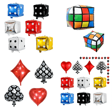 Casino ballon-guirlandesæt indeholder hovedsageligt latexballoner, de kommer i forskellige størrelser (5 tommer, 10 tommer, 12 tommer og 18 tommer). Deres farver er normalt domineret af rød, sort, guld osv. For at forstærke den lagdelte effekt af sættet kan du også se gennemsigtige latexballoner og konfetti latexballoner. Som temaet for sættet er casino-temafolieballonerne også uundværlige.