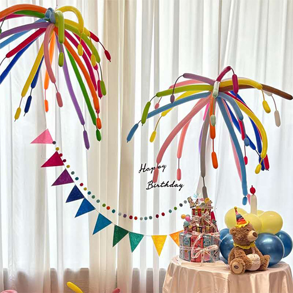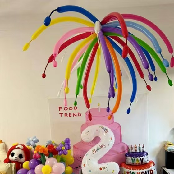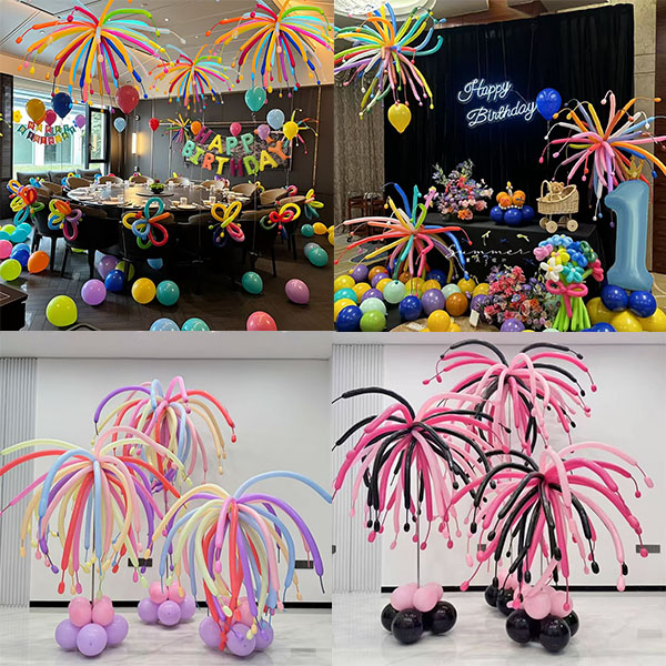 Til formdesign. Inspirationen kommer fra fyrværkeri, der sprænger på nattehimlen. De er lyse, dynamiske og iøjnefaldende. Det kopierer perfekt formen på fyrværkeri, når de brast. Lange ballonstrimler strækker sig og spreder sig fra midten. Små balloner tilsættes i enderne. De ligner gnister fra at eksplodere fyrværkeri. Livsfri og levende. Hæng dem på festloftet. Eller læg dem på jorden som dekorative søjler. De skaber en smuk visuel effekt af fyrværkeri, der sprænger øjeblikkeligt. Festgæster vil føle, at de er i et fyrværkeri. Nedsænket i en glad og livlig atmosfære. Ballonbasen i bunden er også godt designet. Firearbejdeformede balloner med forskellige farvekampe. Deres baser bruger matchende ballonkombinationer. Basen holder ballonen stabil. Det forbedrer også den samlede dekorative skønhed. Gør hele fyrværkeriformet ballon integreret fra top til bund. Bliver et smukt syn på festen.