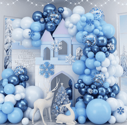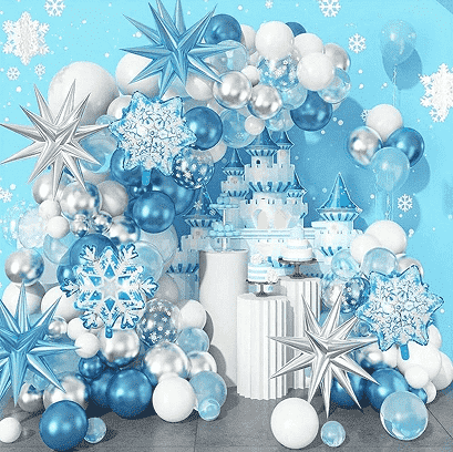 3.Frosne ballonguirlandesætindeholder normalt forskellige størrelser affrosne balloner, unikke folieballoner, matchende dekorative bånd, oppustere, umærkede limpletter, monteringsbånd og andet tilbehør for at opfylde layoutkravene i ét stop. Alle komponenter er lavet af sikre og miljøvenlige materialer, fuldt tilpasset børns aktivitetsscener. Ballonmønsteret i dragten er nøje afstemt og kombinerer det klassiske karakterbillede af Frozen med de drømmende is- og sneelementer. Farverne er blå, hvid og sølv, hvilket skaber en ren og romantisk magisk atmosfære.