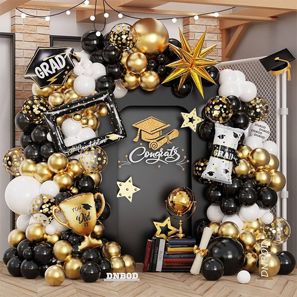 I en ceremoni for at fejre dine præstationer på din akademiske fase, er det perfekt at dekorere din dimissionsceremoni med ballonguirlande afgangsfolieballon. Denne ballonguirlande bruger den klassiske afgangsfest farvetone, såsom sort, guld og hvid. Alle latexballoner i dette ballonguirlandesæt er lavet af naturlatex og er strengt testet og udvalgt til sikker brug. Match den med metalliske latexballoner og gyldne konfettiballoner for at gøre den mere skinnende. Og vi tilføjer også en række ikoniske afgangselementer, såsom eksplosionsstjerneballon, eksamensbevis folieballon, trofæfolieballon, ungkarlehatfolieballon og fotorammefolieballon, for at skabe en levende og attraktiv dimissionsstemning til din fest. Derudover understøtter vi også gratis tilpasning af ballonguirlande med gradueringsfolieballon af emballage og omslag. Du kan sende os dit logo eller det indhold, du ønsker at tilpasse. Vi har en professionel designafdeling, der vil lave den emballageeffekt, der tilhører dig, for dig, og der er ingen ekstra omkostninger for at hjælpe dig med at blive mere konkurrencedygtig på markedet og fremhæve dit brands karakteristika.