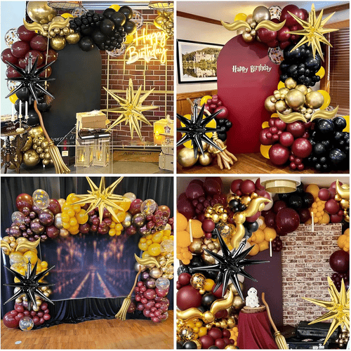 Latexballonen i Harry Potter-tema ballonbue er lavet af 100% rå latex, som er importeret fra Sydøstasien. Da de er naturmaterialer, er de helt miljøvenlige og harmløse for børn og voksne. Deres farver er symbolske farver i Harry Potter-filmene, herunder vinrød, gul, sort og guld. For at tilføje flere lag, har vi også tilføjet konfettiballonen, konfettien er metallisk guld.