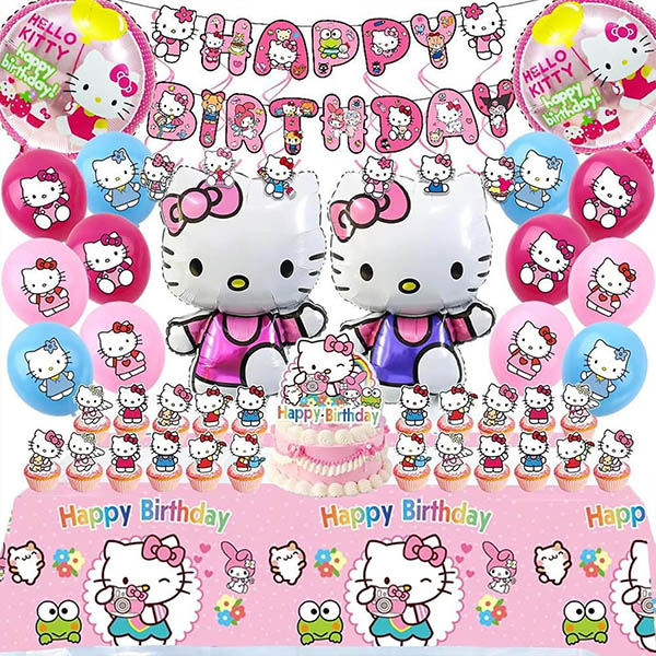 Dette latexballonfestsæt med hello kitty-tema består af banner til tillykke med fødselsdagen, kagedekoration, latexballon med hello kitty-tema og cupcaketopdekoration. Alle dekorationer i denne pakke er lavet af materialer af høj kvalitet, med lyse farver og smukke mønstre. Materialet er tykt og ikke let at beskadige, hvilket kan sikre, at dekorationerne i pakken forbliver i god stand under fejringen af begivenheden. Uanset om det er en fest, en fødselsdagsfest eller en sjov fest, er dette festsæt med tegneserietema ideelt.