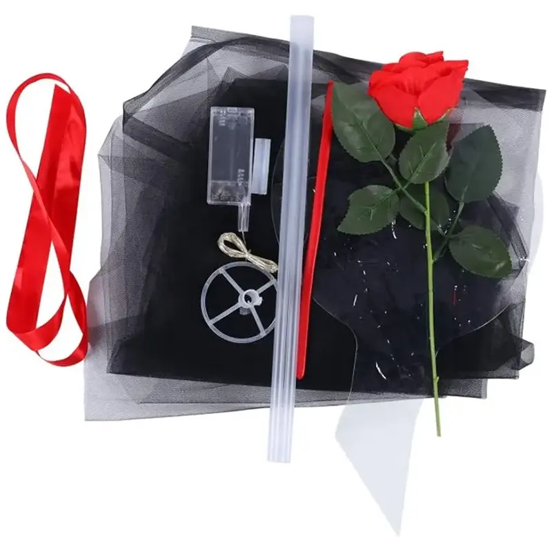 LED -lysstrimler, buketpapir, paljetterpapirrester, kunstige roseblomster |