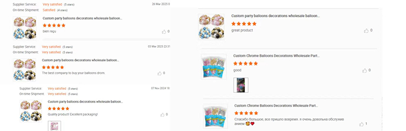 Vi bruger importeret blækbelægningsteknologi til vores metalliske balloner. Farverne er jævne og rige. Tag dem på billederne som eksempler. De omfatter metallisk champagneguld, metallisk blå og metallisk lilla. Disse farver har vist sig at være populære på europæiske og amerikanske markeder. De passer til mange lejligheder. Disse lejligheder er bryllupper, fødselsdage og jubilæer.