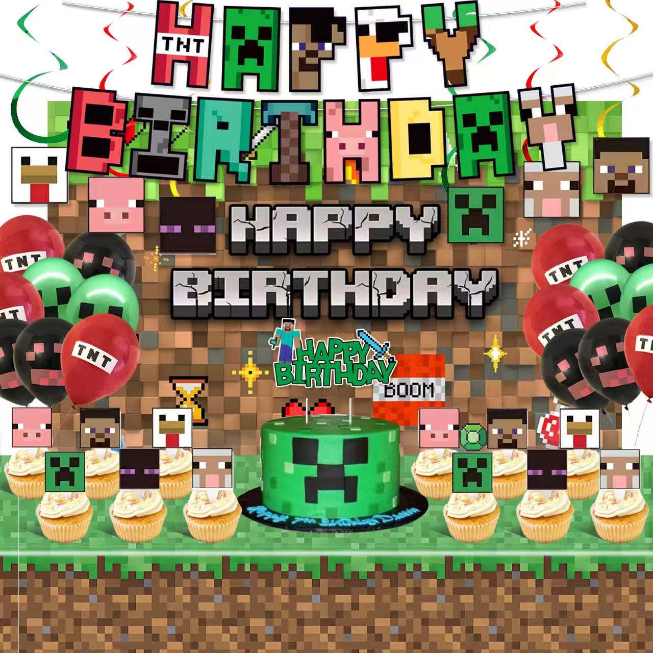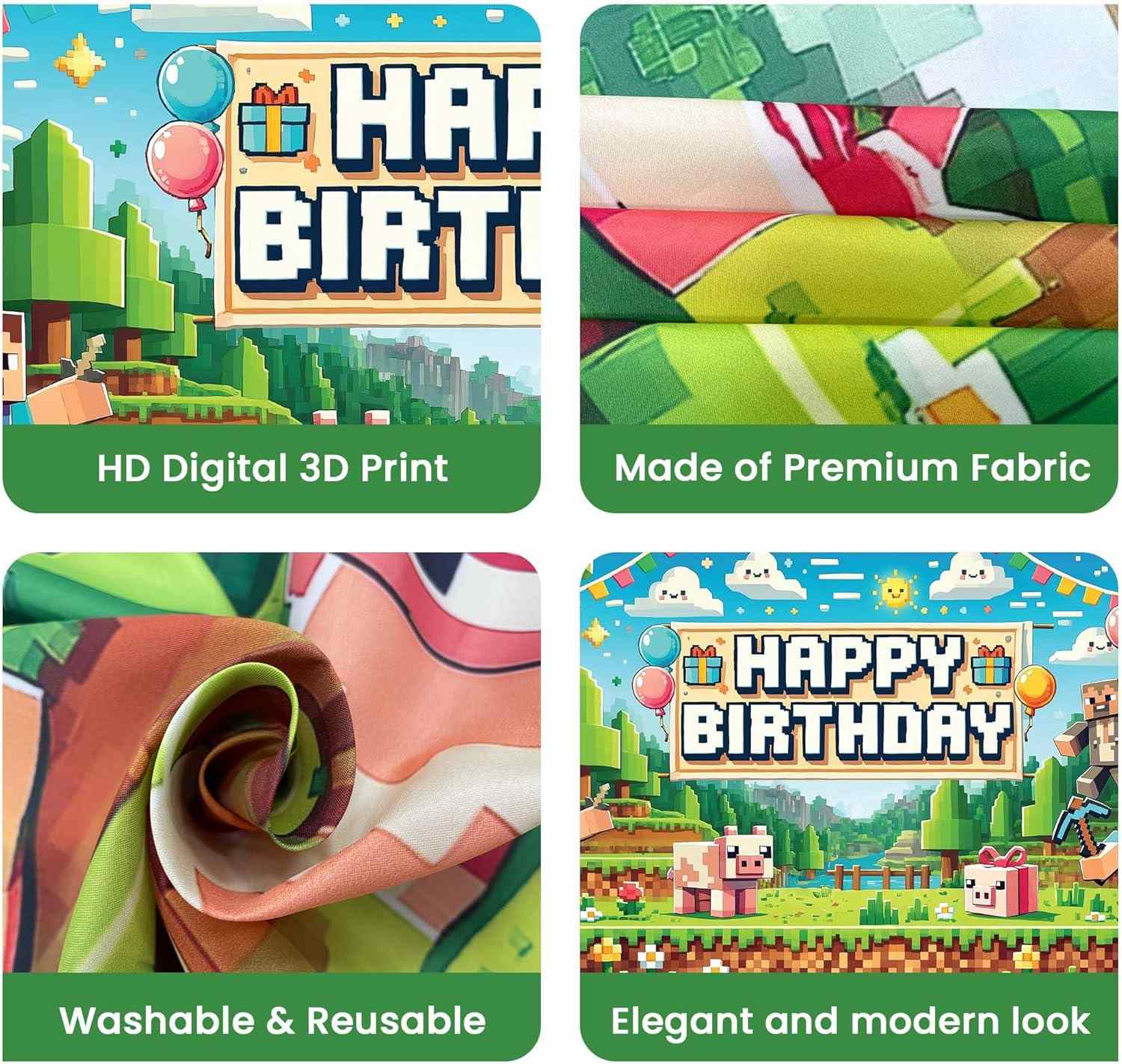 Minecraft -baggrund er den vigtigste visuelle del af festscenen. Designet tager ideer fra klassiske spildele. Det viser pixelhimmel, græs, træer, bygninger og Steve. Disse dele slutter sig til for at lave en fuld blokverdensscene. Billedet har lys farve. Billedet har rige lag. Ordene tillykke med fødselsdagen i pixelstil ser klar ud. Ordene fanger øjet. Baggrunden får festen til at føle sig som et spilland på én gang.