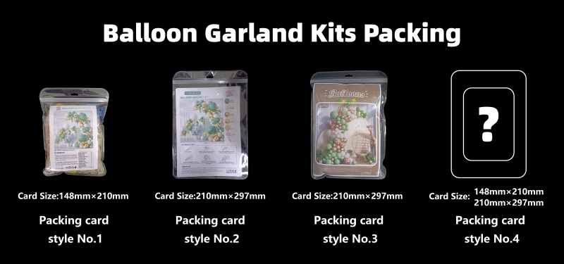 Den anden er OPP-poser med et papirkort. Vi tilbyder to typer papirkort; du kan vælge dit foretrukne design eller skabe dit eget. Denne emballage er bedre egnet til offline salg, såsom i supermarkeder. Ballonbundterne kan hænges på hylder eller stilles op på diske. Papirkortet indeni giver kunderne mulighed for tydeligt at se pakkens stil.