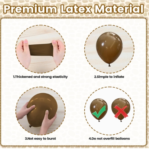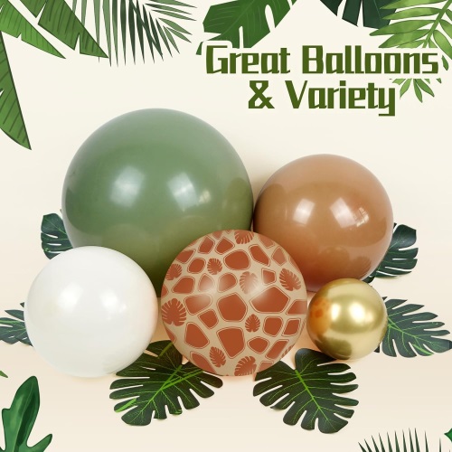 Der er mere end 100 stk latexballoner pr. Safari ballonbue. Det inkluderer 5 tommer, 10 tommer og 18 tommer mørkegrønne latexballoner, 5 tommer, 10 tommer og 18 tommer avocadogrønne latexballoner, 5 tommer, 10 tommer og 18 tommer brune latexballoner, 10 tommer sandhvide latexballoner, 10 tommers 10 tommers bønnegrønne balloner, 10 tommer 10 tommer tegrønne, guld latex balloner, 12 tommer konfetti latex balloner, 12 tommer giraf tryk balloner, 12 tommer tiger tryk balloner og ballon tilbehør.