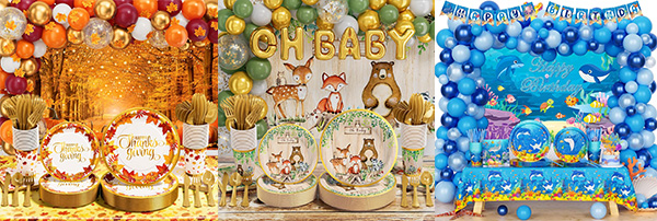 Parter er en primær anvendelse til NIUN® Paper Tableware. Parring med et sæt tema ballongarland kan forbedre temaet. Hver ballongarland har et tilsvarende tema og tilbyder en række farver til perfekt at koordinere med forskellige papirfest -bordssæt. Parring af papirbordsvarer med de tilsvarende tema Balloon Garland Styles skaber en blændende fest!