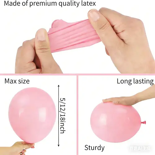 På grund af de råmaterialer, vi bruger og de sikre trykmaterialer, er ballonerne totalt miljøvenlige og uskadelige for børn og voksne. Farverne på dem er for det meste lys farve, såsom pink, lilla, hvid, gennemsigtig. De metalliske guldballoner er også tilføjet, og de gør buen mere attraktiv.