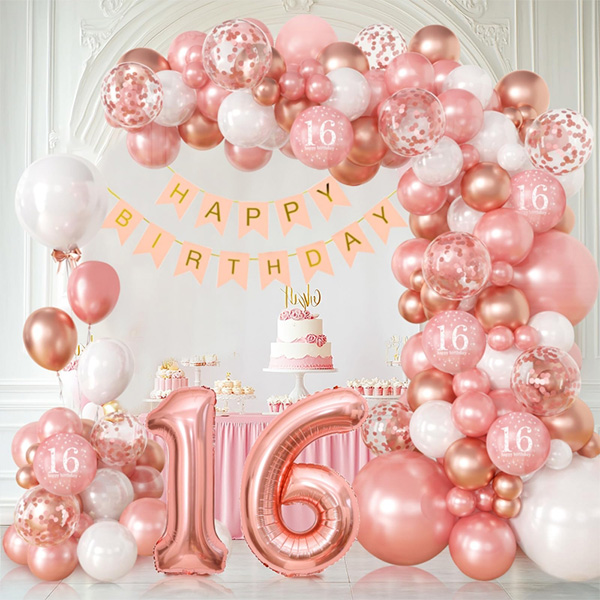 Sød 16 ballonbue denne pakke inkluderer latexballoner, folieballoner, fødselsdagsbannere, limpletter, bånd osv. Hvis du har specielle behov, kan vi også tilpasse ballonstørrelsen, mængden, farven osv. i pakken i henhold til dine kravs.