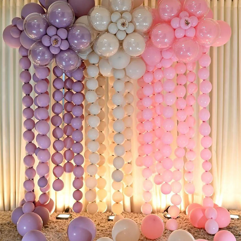 Funktioner:Hale -design letter tilslutning af balloner, hvilket gør skabelsen hurtig og let. Desuden er latexballonerne meget elastiske og fleksible, hvilket giver dem mulighed for at forblive flydende i længere perioder.