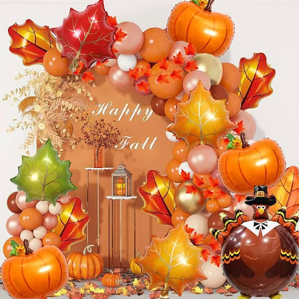 Thanksgiving Balloon Garland Kits er lavet til Thanksgiving Festival. Farverne er orange, bordeaux og guld. De leveres med græskar og ahornblade. De kan tænde hele scenen på én gang. Gæster kan føle den stærke ferieånd, så snart de går ind.