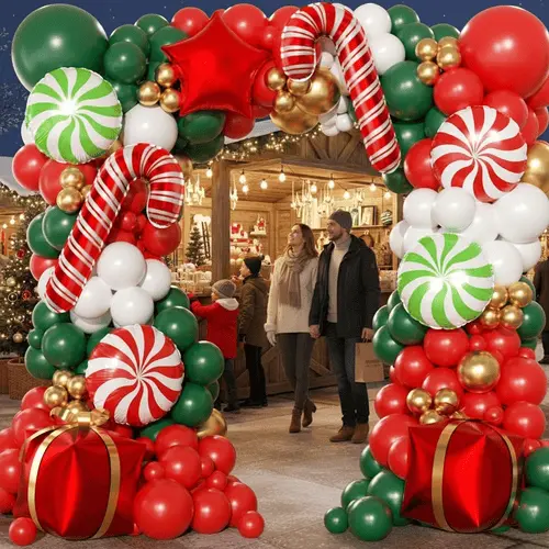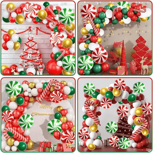 Juleballonbue medfølgerhøj kvalitet og farverige latex ballonerog folieballoner. Latexballonen vi tilbyder er lavet af 100% rå latex, som er importeret fra Sydøstasien. Som det råmateriale, vi bruger, og det miljøvenlige trykfarve, vi bruger, er ballonerne helt miljøvenlige og harmløse for børn. Farven på ballonerne er primært rød og grøn, som repræsenterer julen. For at tilføje lidt dekoration inkluderede vi også gyldne balloner. Den samlede stil af juleballonbuen er glad, attraktiv og fuld af energi.